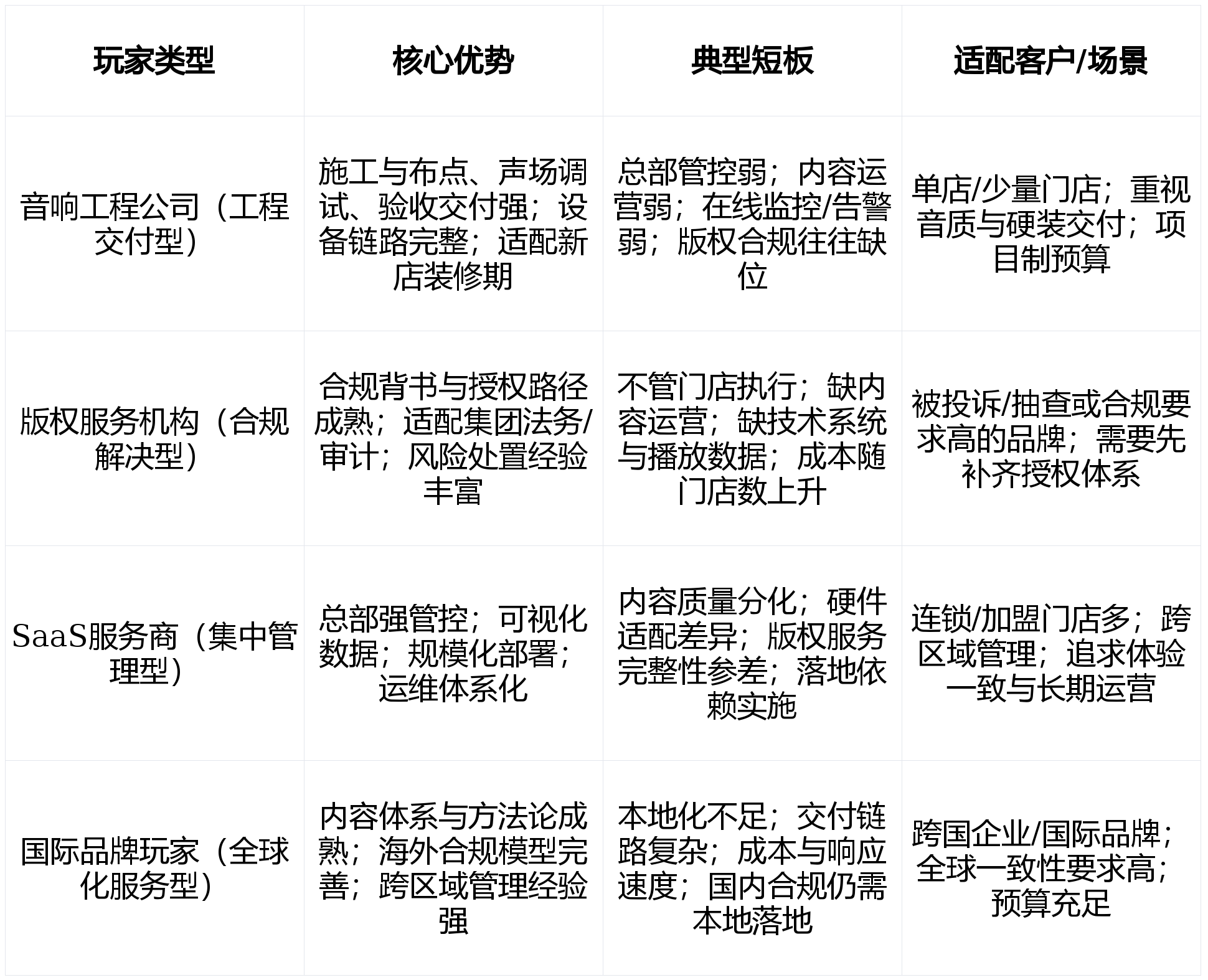 正在现实的门店体验中,(1) 空间体验被纳入品牌资产办理:品牌起头把“门店空气”写入品牌手册取运营尺度, 品牌声标(2–5秒)取门店声景(BGM + 语音规范 + 音效)配合形成品牌的声音识别系统。成熟系统凡是由四个层级形成:声音计谋层、内容运营层、手艺系统层、设备工程层。业态笼盖商场店、街边店取社区店,半夜播放什么,听觉体验是整个感官体验的焦点之一,缺一不成。(2) 门店施行难以监视,· 优先级节制: 叫号 勾当 BGM(可按业态调整)。合适的音乐能提拔门店20%以上的换座率。连锁品牌的音乐运营系统拆为四个模块:品牌音乐DNA建立、分时段音乐策略、节日音乐机制、加盟施行办理。总部难以发觉能否按要求播放、播了什么。而是一套从计谋到落地、从内容到手艺的系统工程。 也难以持续施行,还需要成立“贸易利用授权机制”,正在效率取体验之间取得均衡。行业玩家可按焦点能力分为四类:声响工程公司、版权办事机构、SaaS办事商取国际品牌玩家。环节不是“能播放”,内容基于公开材料、行业取店音的丰硕行业经验进行拾掇,②从一次性到可运营(体验要能被持续迭代,· 提拔复访取认同:熟悉的声音空气带来归属感,(3) 版权合规风险取舆情风险累积,门店复制扩张时更容易快速“做出同款体验”,就能将店内的产物融合正在一路,音乐策略常取门店运营方针绑定:提拔翻台效率、耽误逗留、提拔客单或降低赞扬:· 平台化取可集成:通过API/系统对接打通运营系统、营销排期取内容审核流程。集中授权模式指由总部同一完成版权采购、授权取办理,并要求可复制、可查抄、可量化,而布景音乐是一个很是适合打制差同化的标的目的。 让品牌可运营、可权衡。合规风险最终反噬品牌。让顾客去任何一店,布景音乐被当做“无关紧要的小事”,事明,· 成立年度音乐运营日历:节日、品牌周年庆、会员日、季候节点取促销周期。4. 沉淀声音资产:品牌从题音乐、门店声景模板、勾当音乐、声标取播报语音规范。· 从“布景”到“体验驱动”:声音被视为体验设想的一部门,最容易打制奇特征,这种影响次要来自曲风、节拍(BPM)、音色质感、音量曲线取曲目连贯性,而是“可控、可视、可运营、可审计”。· 同一签订授权和谈:明白场景、笼盖门店、地区、刻日、费用口径取类型;间接后果:品牌体验不分歧 + 顾客体验蹩脚 + 内容版本紊乱 + 潜正在版权风险持久累积。本用于行业研究取方参考,出格是采办下单行为。以及SaaS取物联网成熟,焦点表示为:· 从单点到全链:门店声景(BGM/声景)、App交互提醒音、社交内容、勾当现场等触点同一。明白场景、范畴、刻日取留存等。让每个分区都能实现其最大化的功能。· 法则可设置装备摆设:不店、分歧区域、分歧时间段采用分歧优先级取压音幅度。